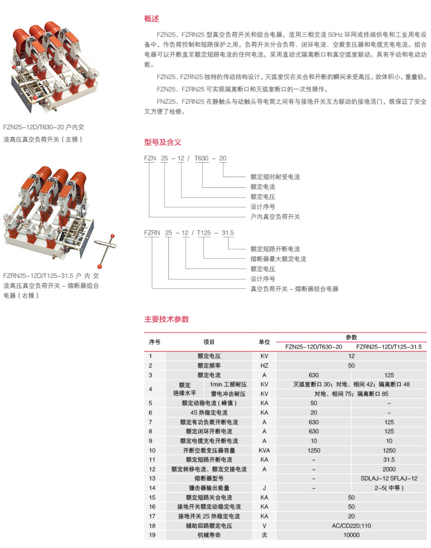 FZN25、FZRN25型真空负荷开关和组合电器,适用三相交流50Hz环网或终端供电和工业用电设备中,作负荷控制和短路保护之用,负荷开关分合负荷、闭环电流、空载变压器和电缆充电电流。组合电器可以开断直至额定短路电流的任何电流。采用直动式隔离断口和真空弧室联动。具有手动和电动功能。...
